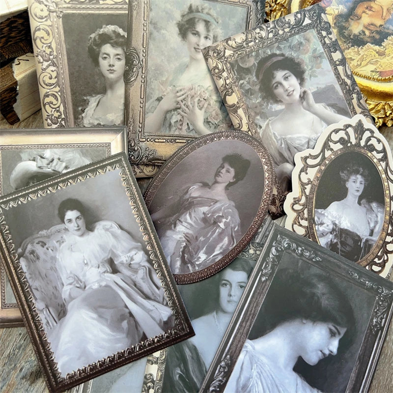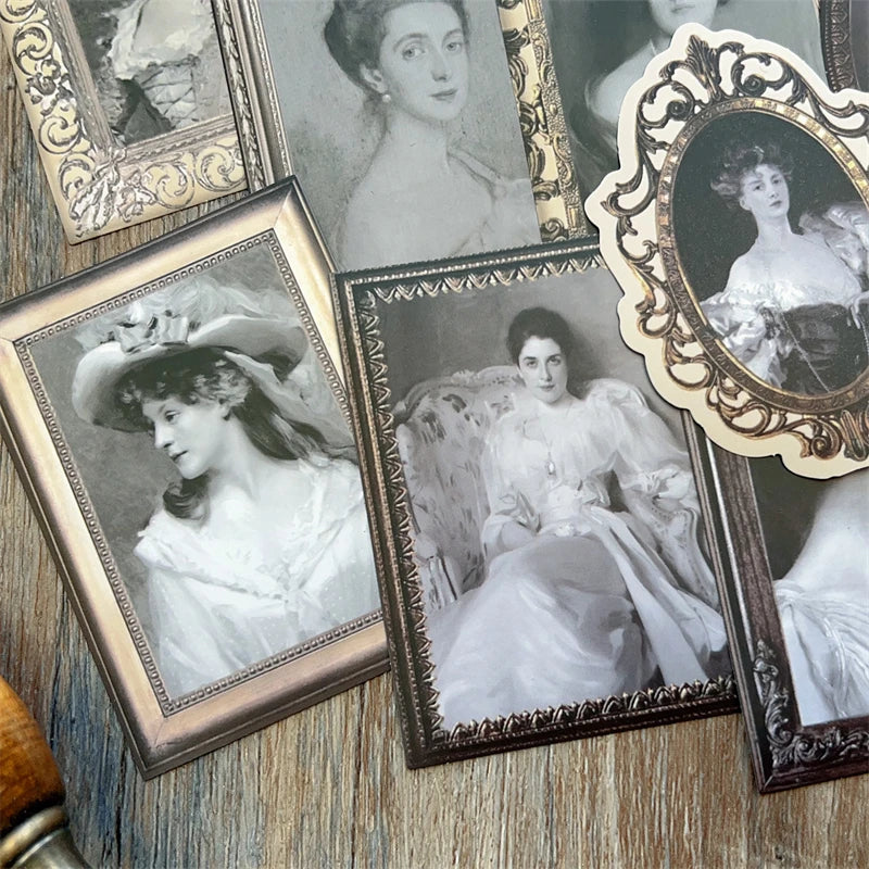 Timeless and quietly elegant, these vintage portrait frame stickers capture the poise and mystery of early European ladies. Each paper sticker is a miniature framed artwork, blending antique portraiture with ornate frame details for a touch of old-world charm. Perfect for scrapbooking, journaling, or decorating letters, these vintage stickers bring a soft romanticism to your paper projects. With delicate grayscale tones and sepia accents, every sticker feels like a page torn from an aristocrat’s photo album — graceful, nostalgic, and beautifully aged.