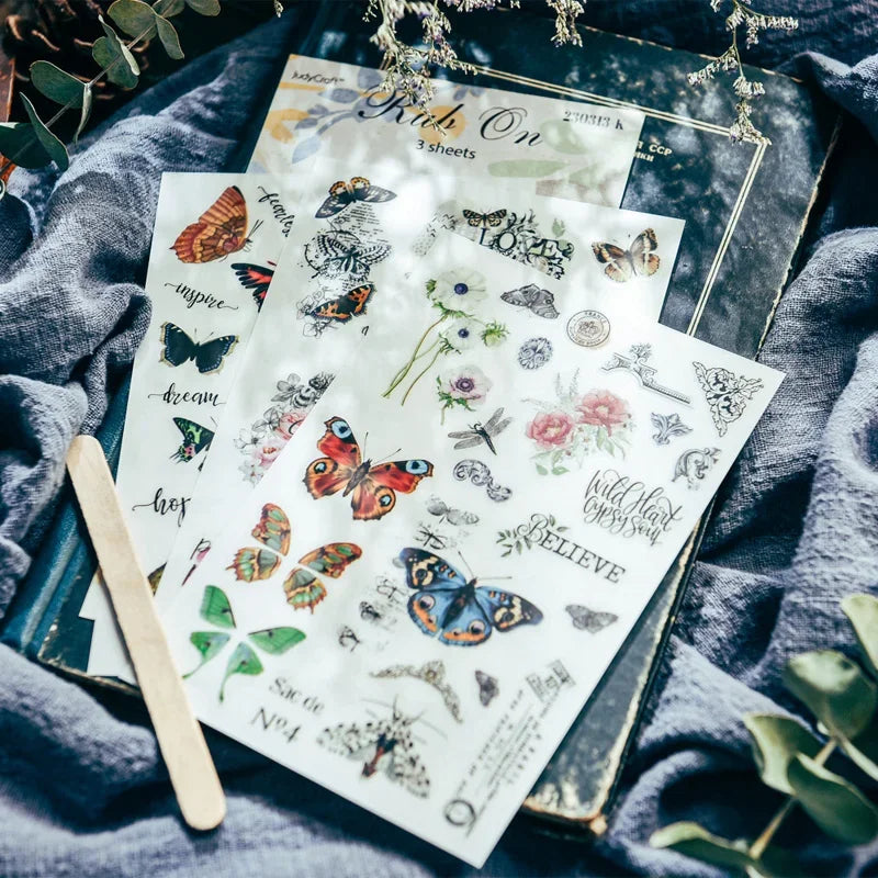 Set of 3 butterfly rub on sticker sheets with detailed designs