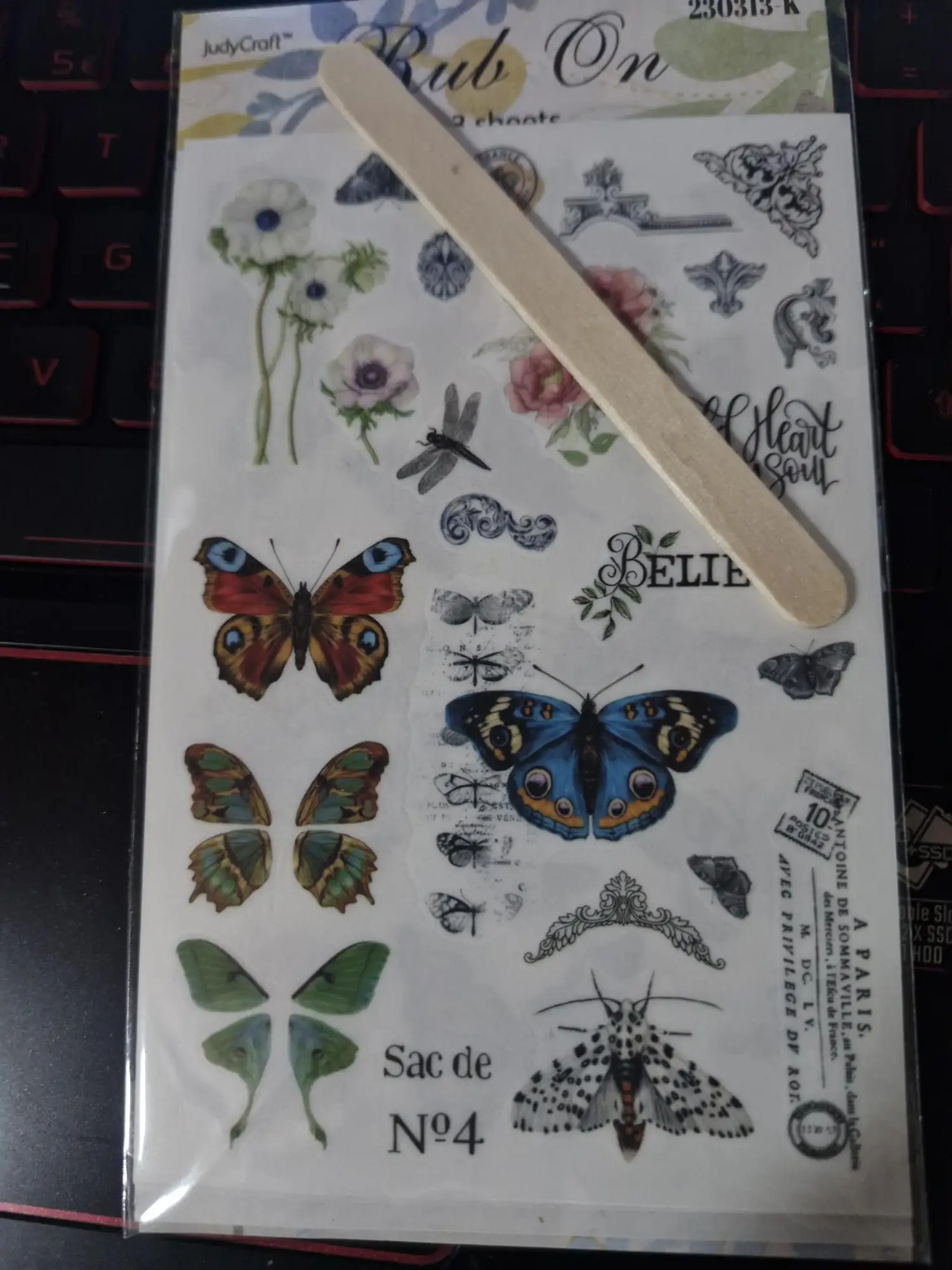 Includes 3 sheets of butterfly rub on stickers featuring botanical and floral details