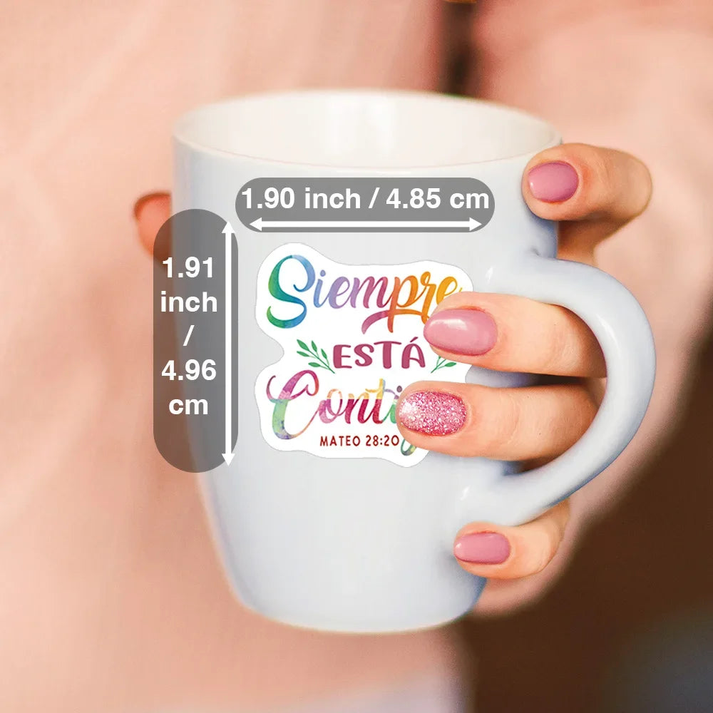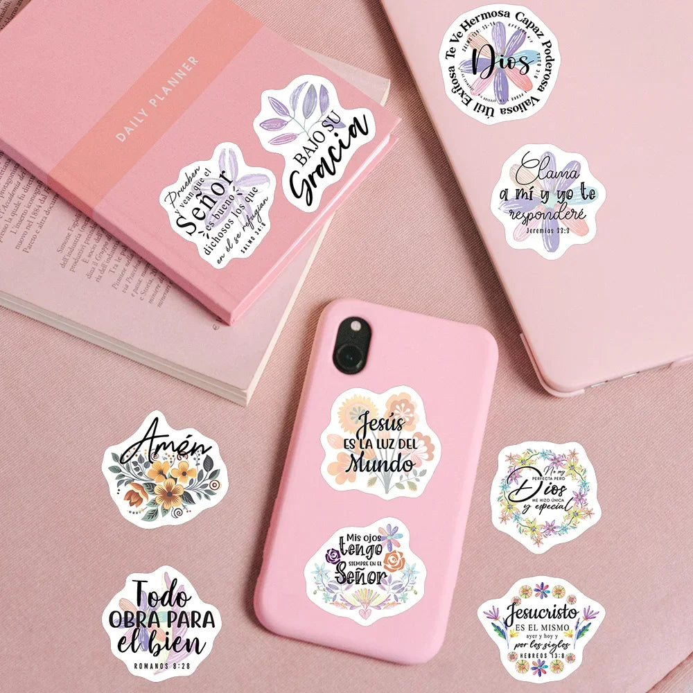The Latina quote stickers set celebrates everyday faith and encouragement through 50 unique designs — each filled with color, charm, and thoughtful typography. Printed on premium paper with a soft, waterproof lamination, these inspirational Spanish stickers feel both delicate and durable.