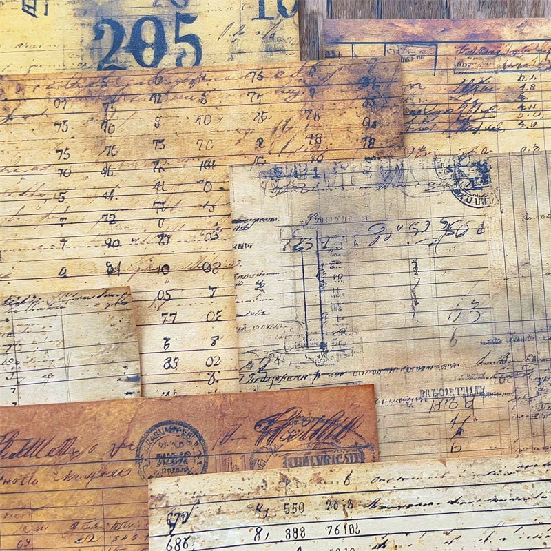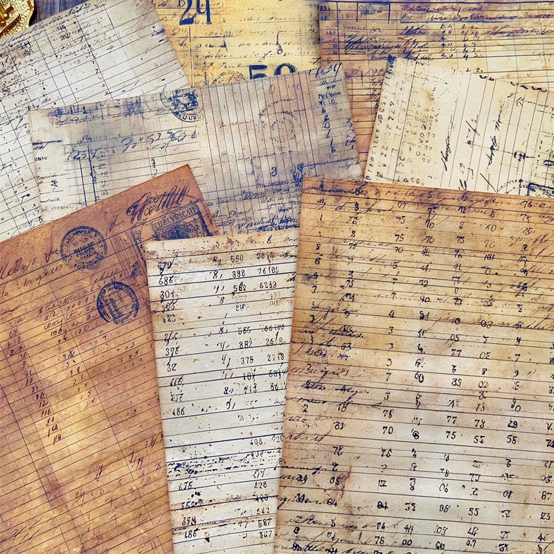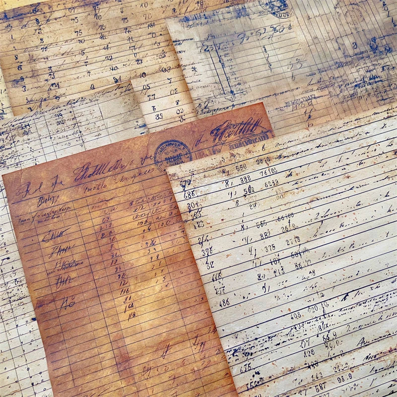 Vintage ledger paper with stories to tell. Each sheet in this coffee-dyed ephemera set is printed with aged handwriting, accounting marks, and archival stamps—capturing the quiet beauty of forgotten paperwork. The coffee-dyed finish brings warmth, depth, and the patina of time to every page. Double-sided printing gives you more texture, more detail, and more room for your creativity. Perfect for journaling, collage, mixed media, or any project that calls for a touch of the past. Every set is handcrafted and truly one of a kind.