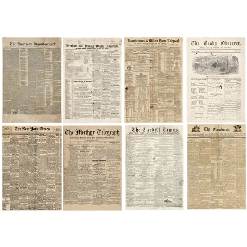 Set of 8 unique vintage newspaper designs – authentic print-style reproduction