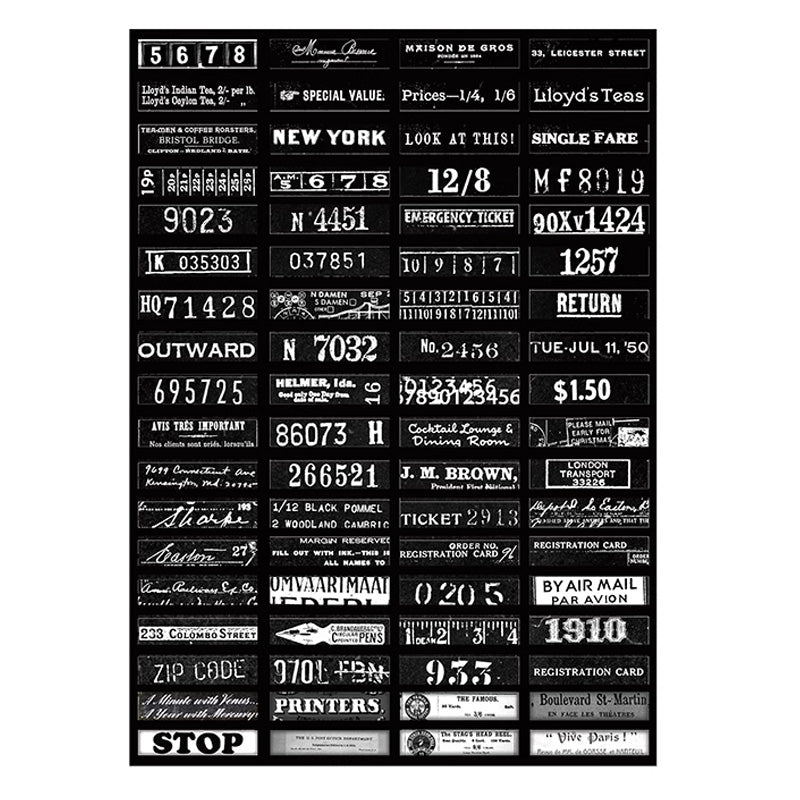 70 unique black-and-white typography sticker strips inspired by vintage signage and tickets